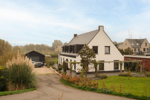 The home features five bedrooms, including a multifunctional room on the ground floor that’s ideal as an office or practice space. The split-level layout between the living room and kitchen creates a playful and light-filled atmosphere. In addition, the property boasts an A+ energy label, two bathrooms, a storage room, and two private indoor parking spaces with direct access to the home.