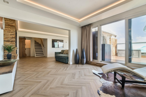 Thanks to the playful split-level layout, you step down into the comfortable living room, which feels bright and spacious due to the high ceilings and large windows. From the living area, you have direct access to two sizeable southwest-facing terraces—perfect for relaxing with a good book, enjoying a long summer evening, or unwinding in the sun with a drink in hand.